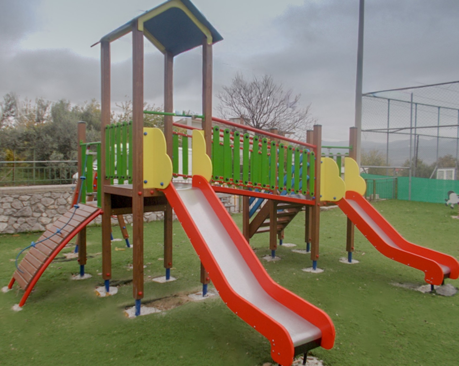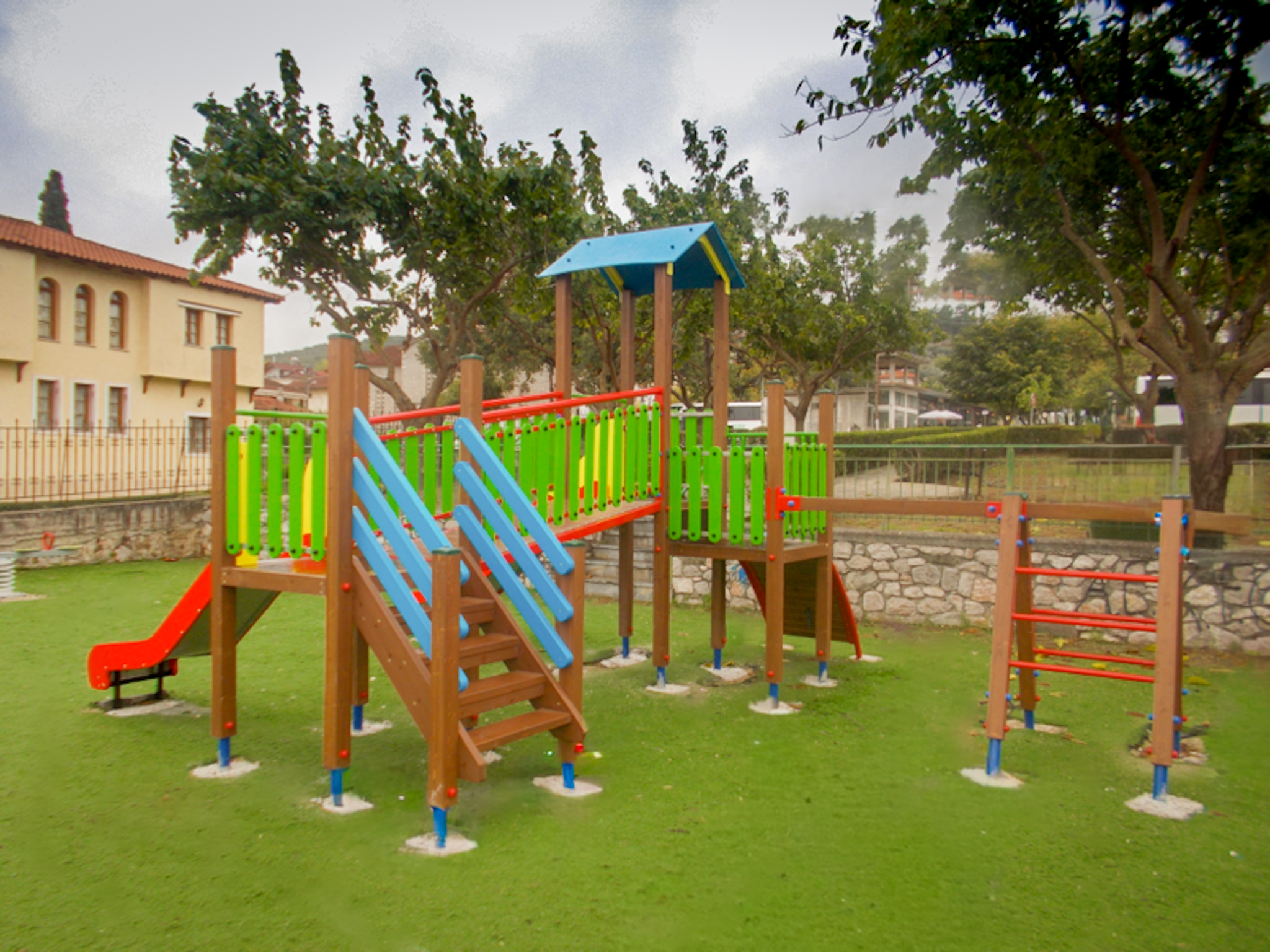• Προσαρμοζόμενη κεκλιμένη αναρρίχηση:Η αναρρίχηση αποτελείται από τέσσερις (4) ξύλινες επικολλητές δοκούς διατομής 100Χ100mm ενωμένες σε σχήμα Λ, μία (1) οριζόντια ξύλινη επικολλητή δοκό διατομής 100 Χ100 mm που ενώνει την αναρρίχηση με το σύνθετο, ένα (1) μεταλλικό πλαίσιο από κοιλοδοκό 30Χ20mm το οποίο φέρει κάθετη κλίμακα από σιδηροσωλήνα Φ26mm. Οι ξύλινες δοκοί έχουν ειδική επεξεργασία ώστε να χωνεύεται στο εσωτερικό τους το μεταλλικό πλαίσιο. Η οριζόντια δοκός προσαρμόζεται σε μία από τις κολώνες της πλατφόρμας.