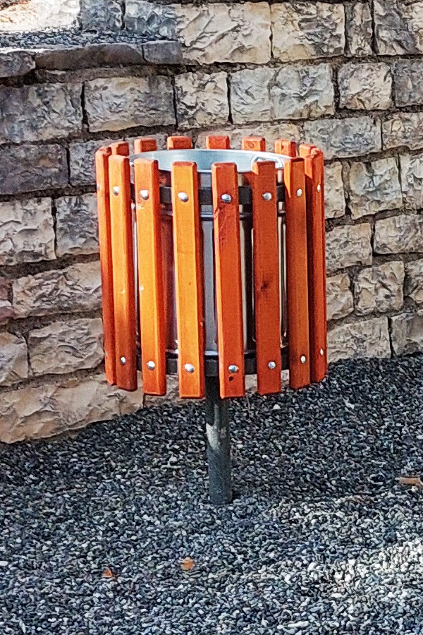 Επιστύλιο δοχείο απορριμμάτων με χαλύβδινο σκελετό, εσωτερικό αποσπώμενο γαλβανισμένο κάδο και εξωτερική επένδυση από ξύλο.