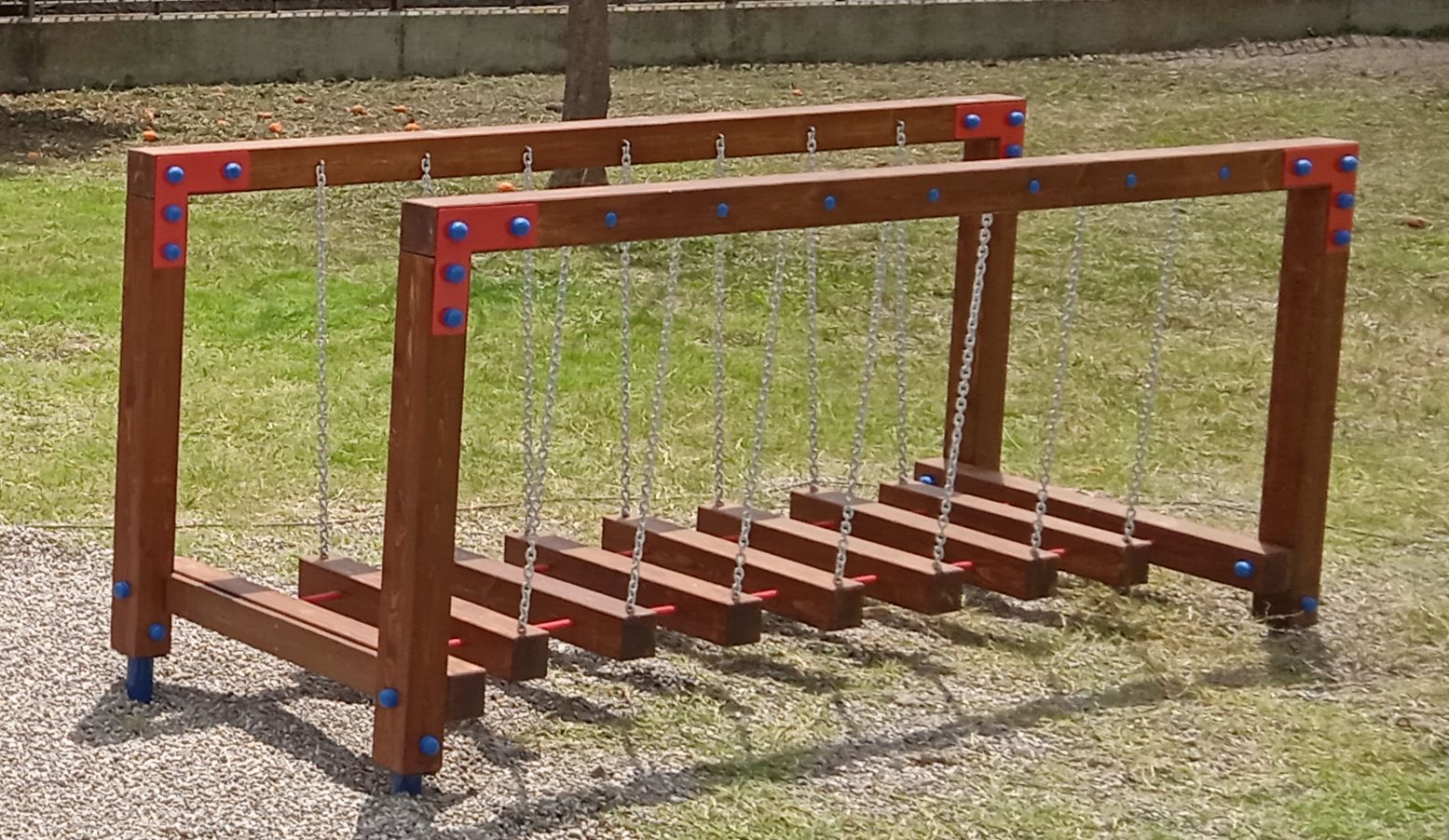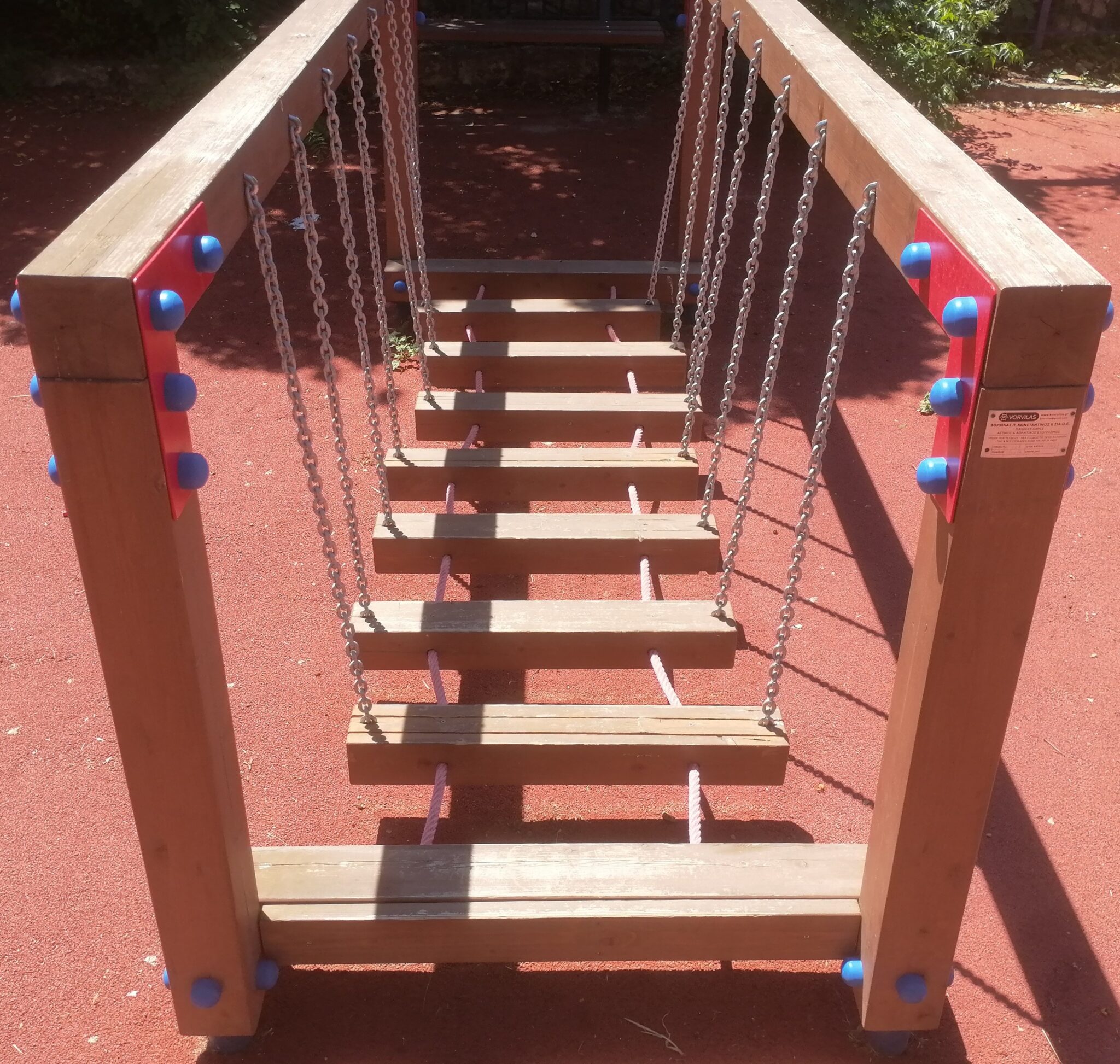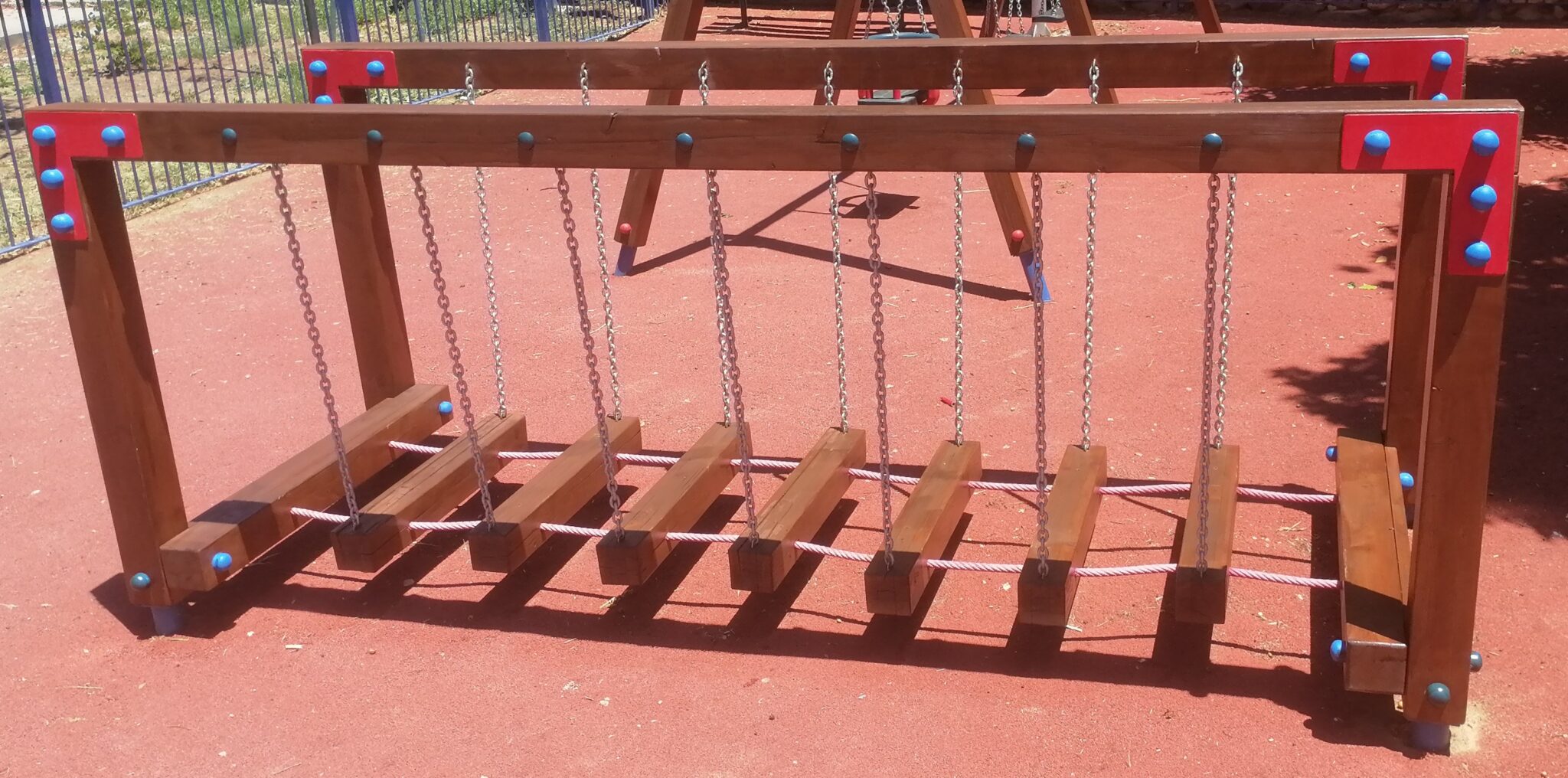 Η βάση της γέφυρας κατασκευάζεται από δύο παράλληλα Π, που το καθένα αποτελείται από δύο κάθετες επικόλλητες δοκούς 100mm x 100mm που ενώνονται μεταξύ τους με μία οριζόντια δοκό ίδιας διατομής. Τα δύο Π ενώνονται μεταξύ τους με δύο δοκούς, μία σε κάθε άκρο , επίσης ίδιας διατομής, που τοποθετούνται κοντά στο έδαφος και είναι η είσοδος της γέφυρας. Ακολουθούν επτά σκαλοπάτια , τα οποία αναρτώνται από τα Π, με τη χρήση ανοξείδωτων αλυσίδων και συνδέονται μεταξύ τους με σχοινί Φ16mm. Ανάμεσα στα σκαλοπάτια τοποθετούνται ειδικοί αποστάτες για την αποφυγή παγιδεύσεων .