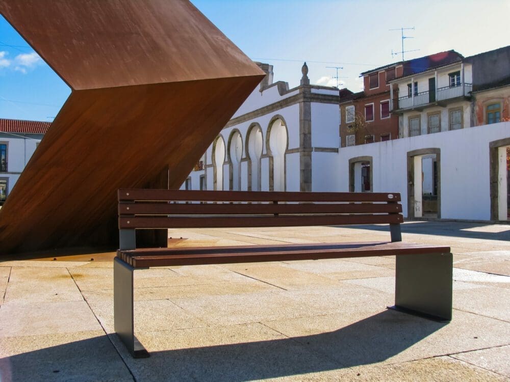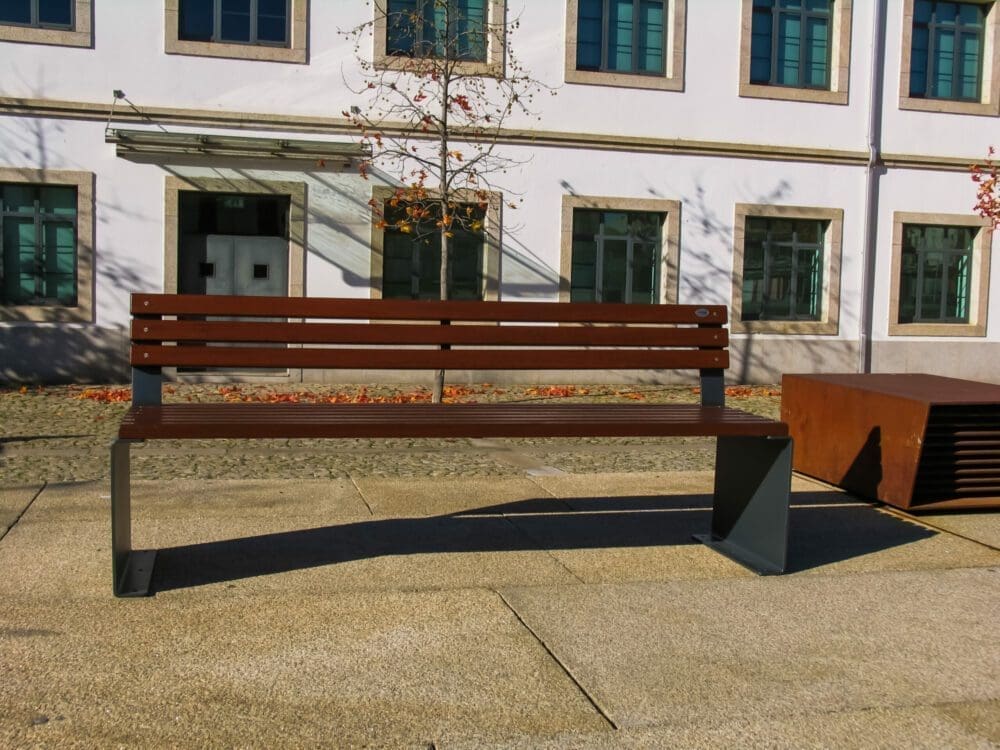 Παγκάκι Leça, αποτελούμενο από δομή από χάλυβα. Φινίρισμα ηλεκτροστατικής βαφής σε θερμοκρασία 230°C. Κάθισμα και πλάτη με σανίδες 60x35mm από τροπικό ξύλο, σε χρώμα κερασιάς, επεξεργασμένα και βερνικωμένα. Εξαρτήματα από ηλεκτρογαλβανισμένο χάλυβα.