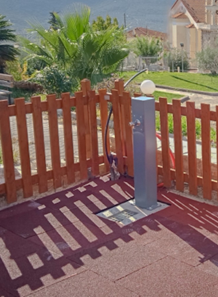 Στο σημείο που καταλήγει η ροή νερού από την κάνουλα, η τσιμεντένια βάση έχει φρεάτιο 0,16×0,25m με οπή απορροής διαμέτρου Ø50mm στον πυθμένα του. Το φρεάτιο καλύπτεται από αντίστοιχων διαστάσεων πρεσαριστή βιομηχανική σχάρα από δομικό χάλυβα S235JR (EN10025), κατασκευασμένη από φέρουσες λάμες 20/2mm και εγκάρσιες ελικοειδείς ράβδους διαμέτρου 3mm, που σχηματίζουν βροχίδες διαστάσεων 35x35mm.